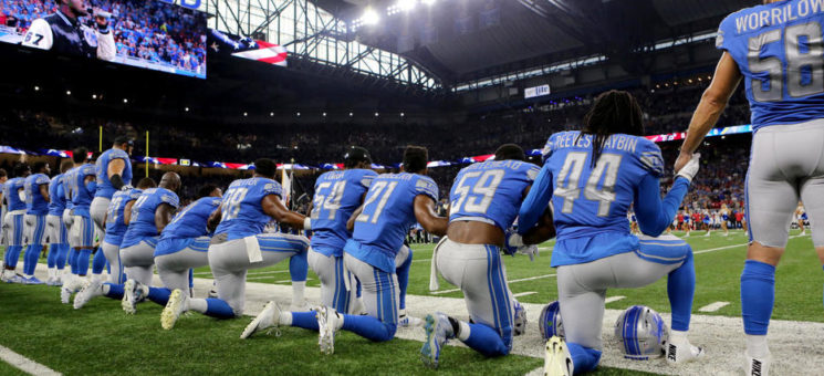 Ce week-end, certains athlètes américains ont posé un genou à terre pendant l’hymne américain afin de protester contre la politique de Donald Trump. source : http://www.lepoint.fr/societe/du-terrain-de-sport-a-la-tribune-politique-25-09-2017-2159787_23.php#xtor=RSS-221